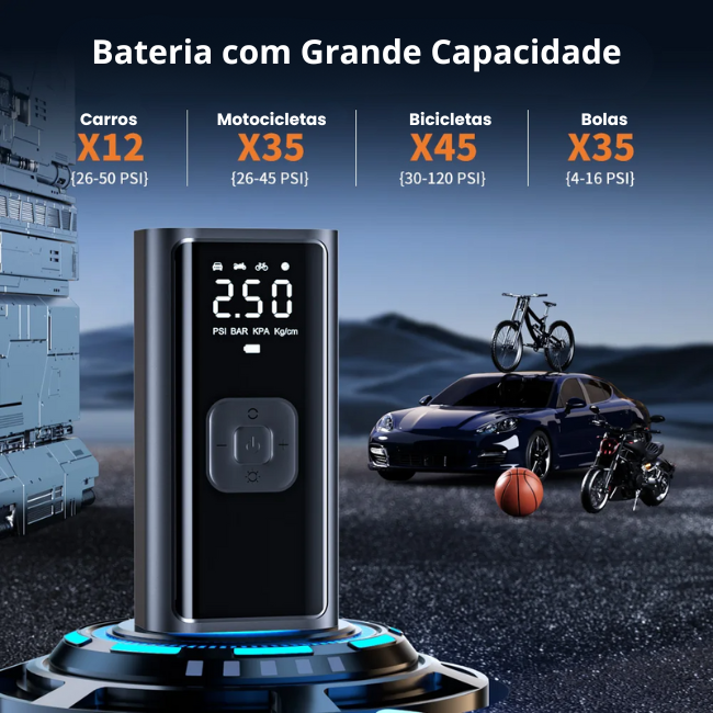 Se você procura praticidade, eficiência e um design moderno, o AirMaster Calibrador Digital é a escolha certa para você! Com tecnologia sem fio, esse calibrador é perfeito para quem precisa de mobilidade e rapidez no dia a dia. Seja para carros, motos, bicicletas ou até mesmo para esportes como futebol e basquete, este calibrador é a solução ideal para garantir que seus pneus e bolas estejam sempre com a pressão ideal.