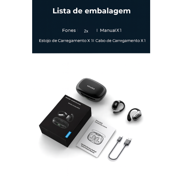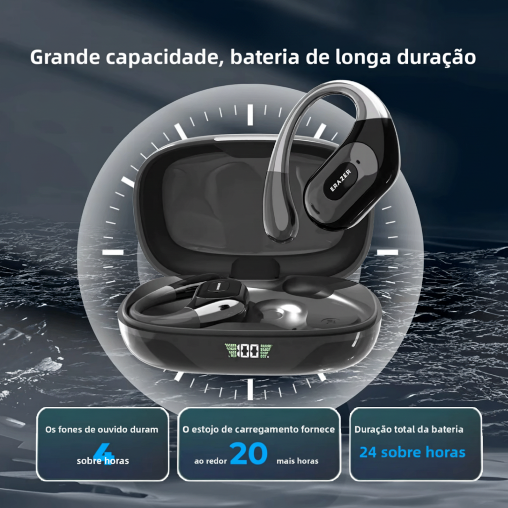 O Fone de Ouvido Erazer é um fone de ouvido OWS (Open Wearable Stereo) de última geração, projetado para oferecer conforto extremo, som potente, tradução por IA, cancelamento de ruído ativo, resistência à água, e conexão Bluetooth 5.4. Ideal para esportes, estudos, telefonia, jogos e para quem busca liberdade total sem abrir mão da segurança e da qualidade sonora.